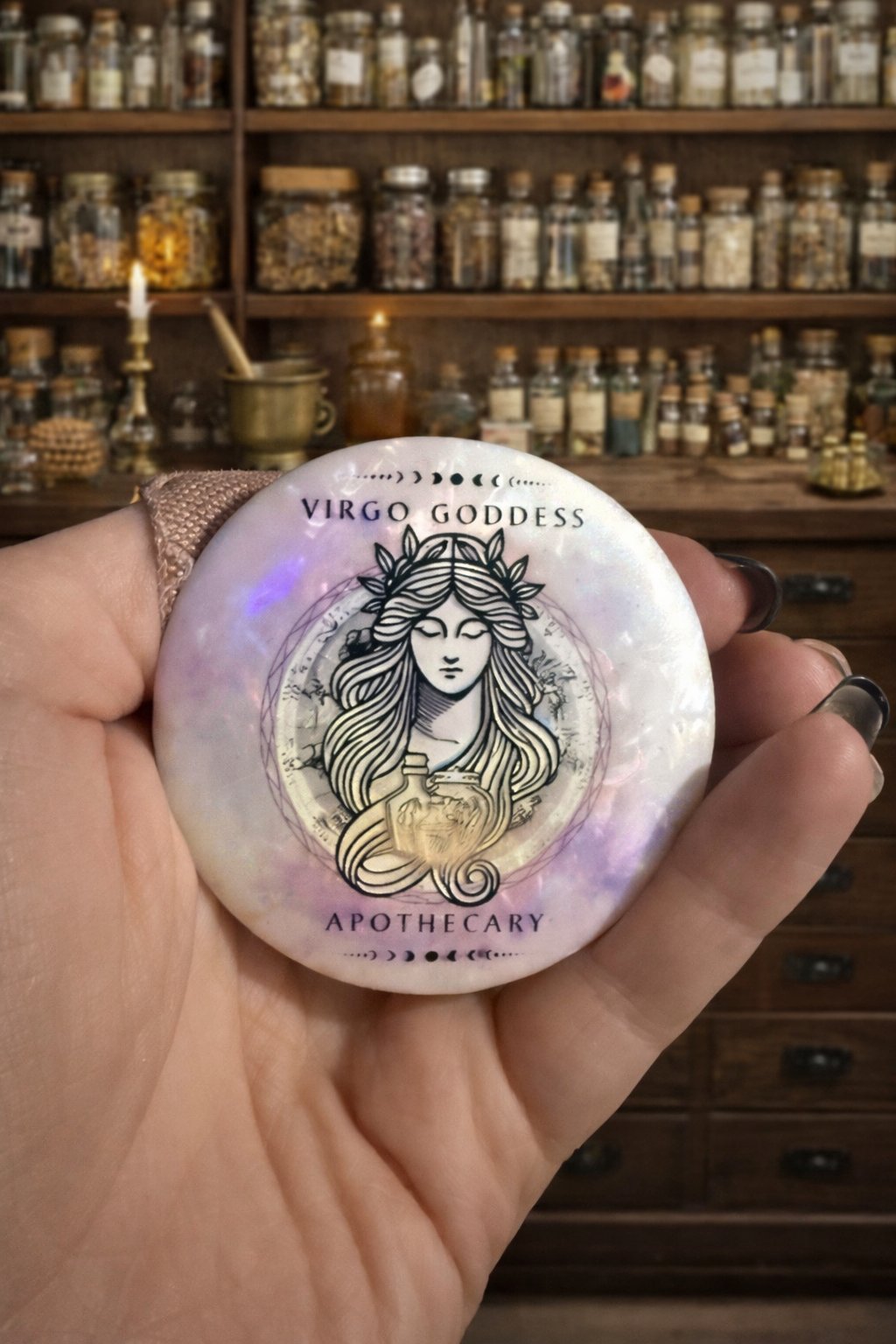 Bold yet serene, the Virgo Goddess Apothecary Button is a wearable symbol of your healing craft and celestial devotion. Featuring your Virgo Goddess design in a soft, cosmic wash of purples and light, this piece turns any jacket, bag, or altar cloth into a statement of identity and intention.