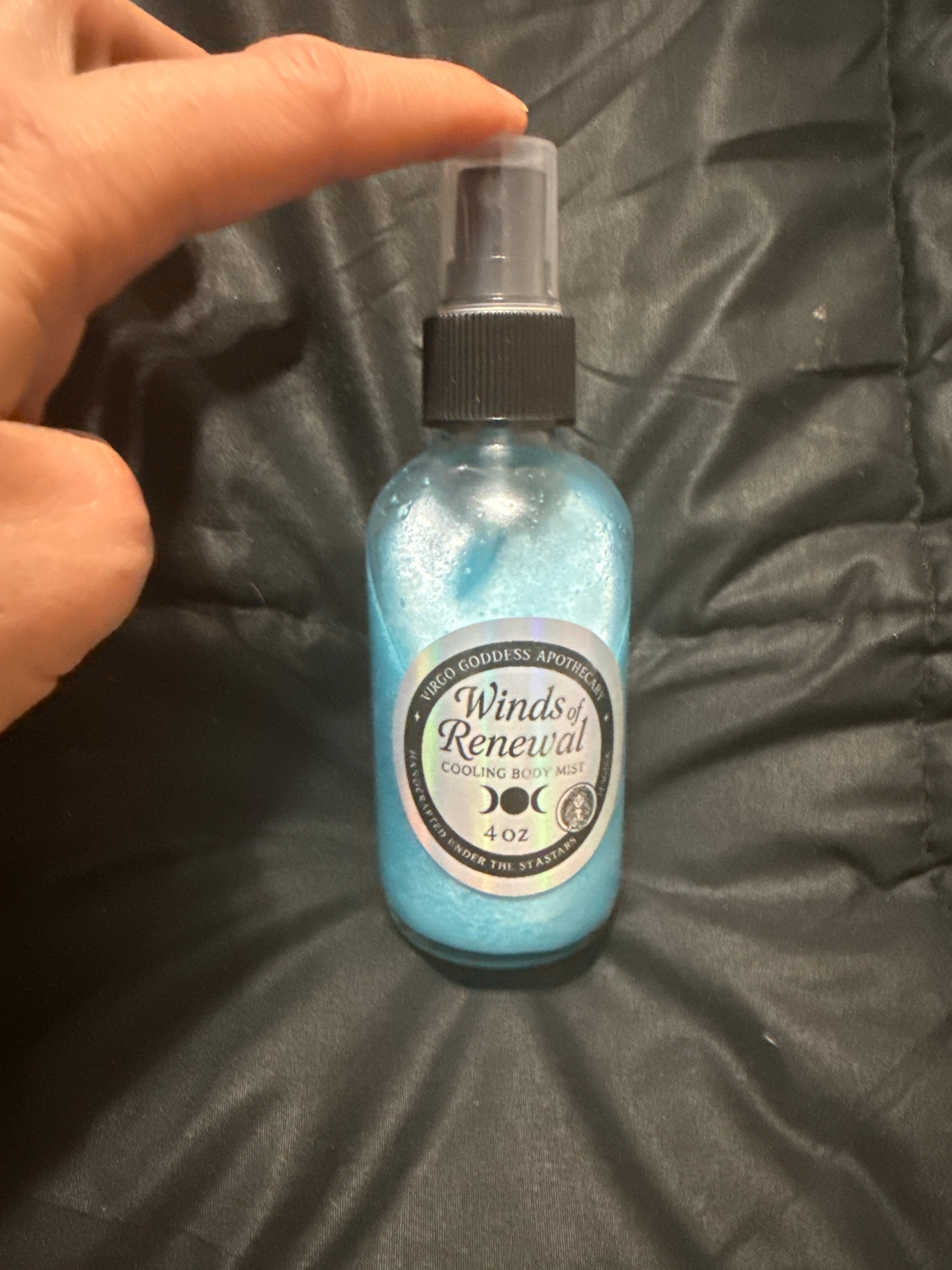 Winds of Renewal is a breath of cool clarity for moments when your body, mind, or spirit feels overheated, tense, or overwhelmed. Crafted with magnesium-charged moon water and infused with clary sage, peppermint, and lemon essential oils, this mist offers instant refreshment with a softly shimmering veil of icy blue mica.